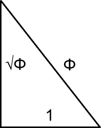 By applying the above Pythagorean equation to this, we can construct a right triangle, of sides a, b and c, or in this case a Golden Triangle of sides √Φ, 1 and Φ, which looks like this: